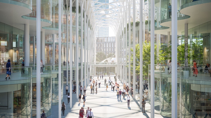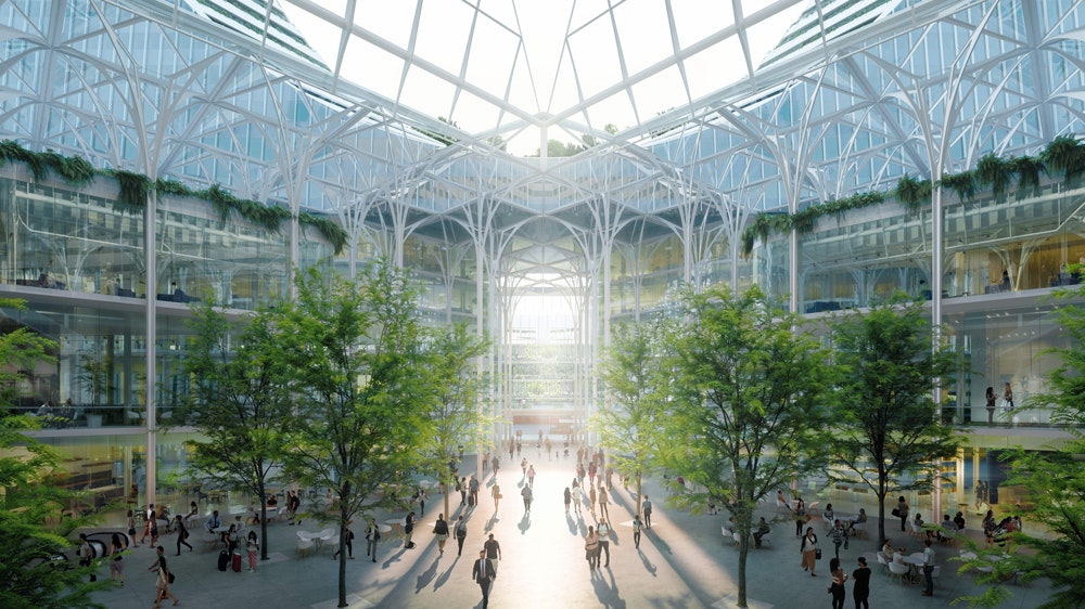 Emerging from the tube into the winter garden you find an urban forest – real trees beneath a glass canopy that unfolds to let in the air and weather – leading to a galleria of pavement cafes and shops. And in a hymn to the ancient orchards that grew on the Peninsula, slender columns create an ‘avenue of trees’, their branch-like crowns supporting the monumental glass canopy.