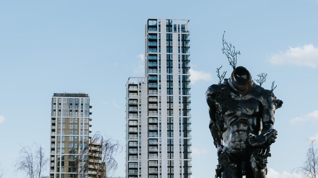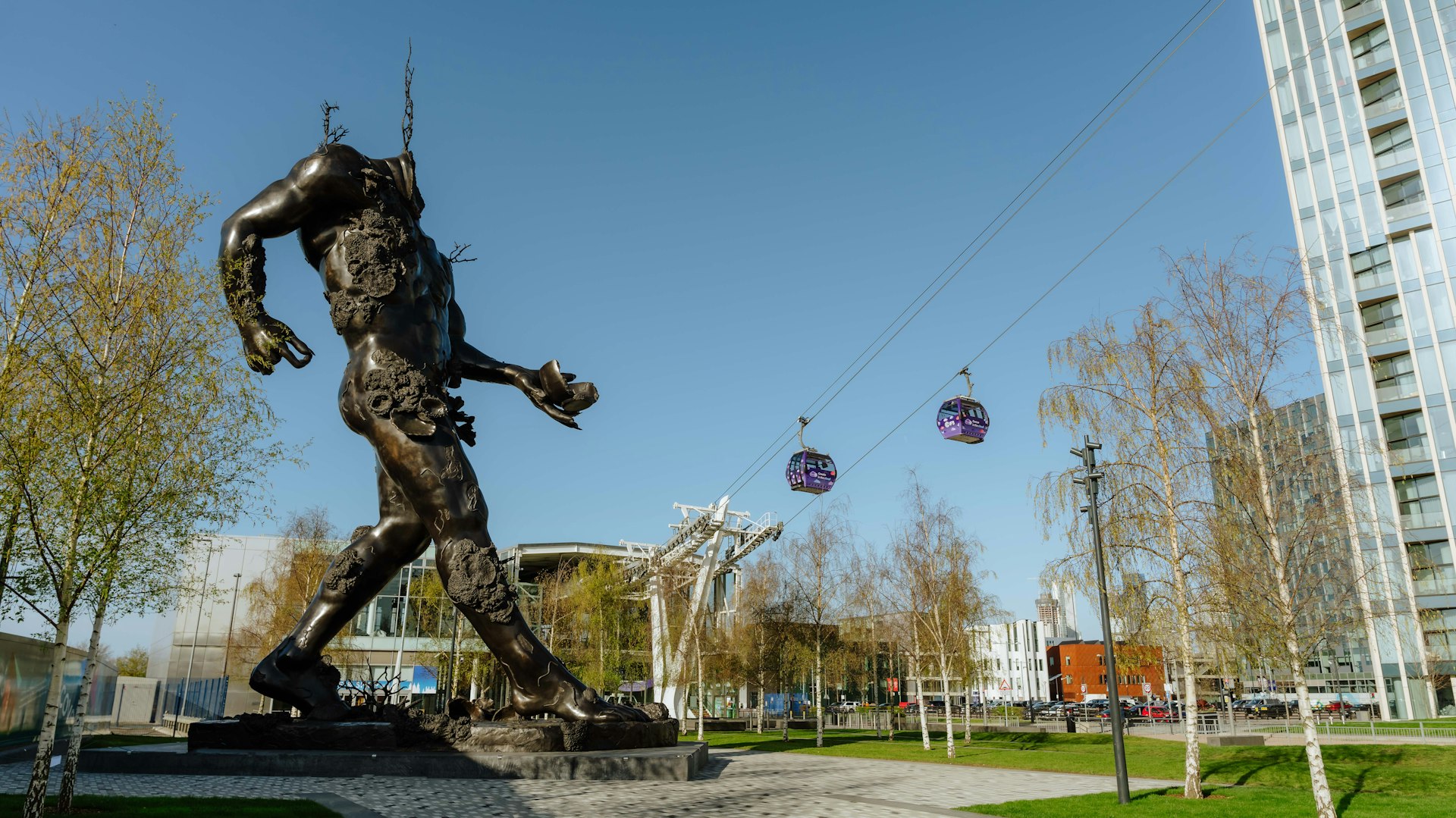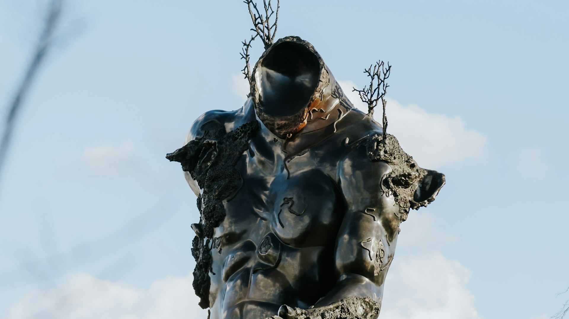 Standing at just over eighteen metres, this monumental figure is presented as a copy of a smaller bronze said to have been recovered from a mythical shipwreck. In the story, the discovery of the body appeared to solve the mystery of a disembodied bronze head with saurian features reportedly excavated in the Tigris Valley in 1932.