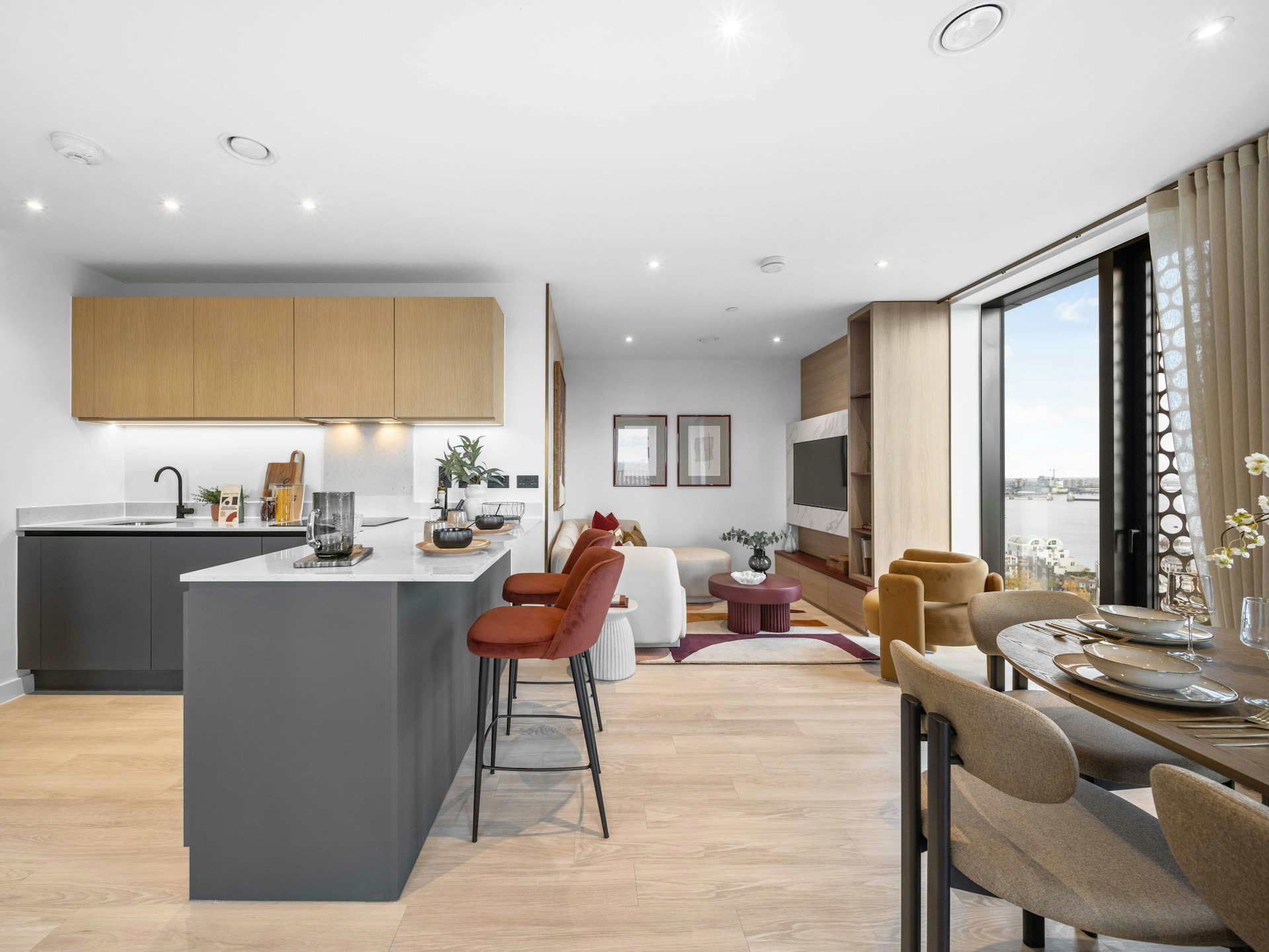 Open plan living and dining spaces with fitted Siemens appliances, quartz worktops, engineered timber flooring and finishes impossible to find at this price point in central London.