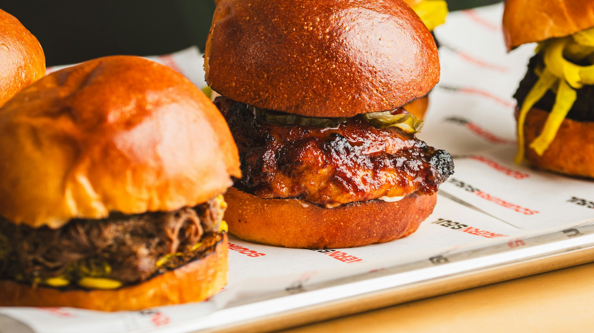 The beef. We smoke a whole chuck roll for eight to ten hours on top of diced vegetables. We then pull the beef and season it with the beef stock that’s produced from the smoke. This gives the pulled beef a beautifully rich, smoky flavour. We make our own house beef jus, which is packed with earthy ancho chillies, garlic, onion and butter, and we braise the beef in that jus before service. We then serve it up in our house milk bun with our bread and butter pickles, American mustard and the option of smoked applewood cheddar.