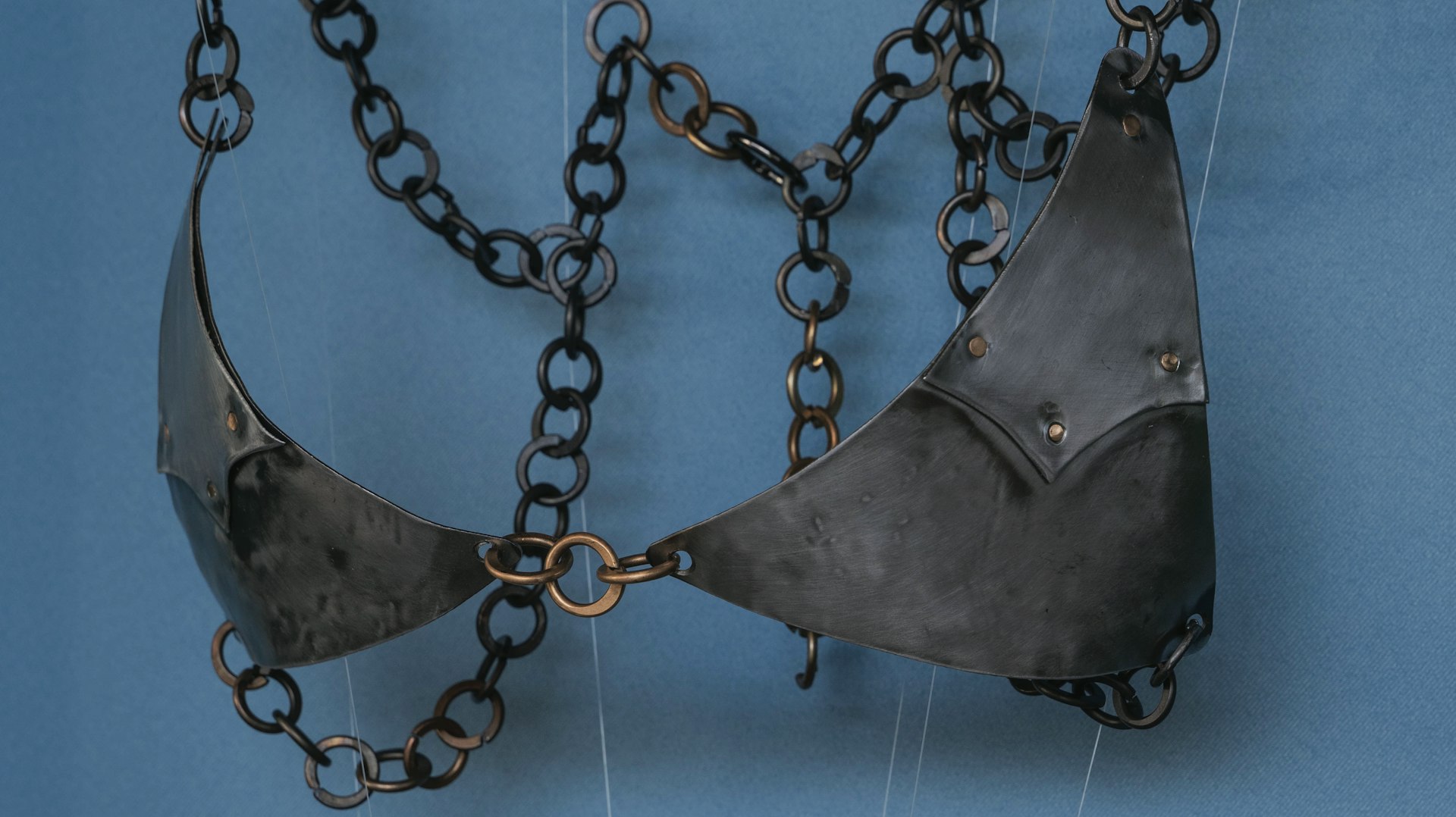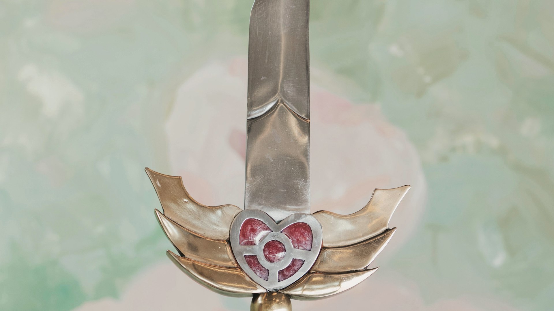 Meanwhile, the smaller paintings and objects — like a Sailor Moon-inspired sword, armoured bikini and metal music box, created with her metalworker friend Fred Thompson — are hidden around the gallery, encased in vitrines on plinths to appear like artefacts from a fantastical world. An unmissable three-metre tall giant plushie has been designed to create a sense of comfort and strangeness, and visitors are encouraged to touch it, or lie down on it while taking in the rest of the show. All of these elements are taken from Charlotte’s own dreamy fantasy, where girliness, sweetness and childhood memories prevail. “I wanted to create a world that was inspired by the fantasy that I grew up on, like Lord of the Rings, but that also has a femininity to it. There are hardly any women in these stories,” she explains.