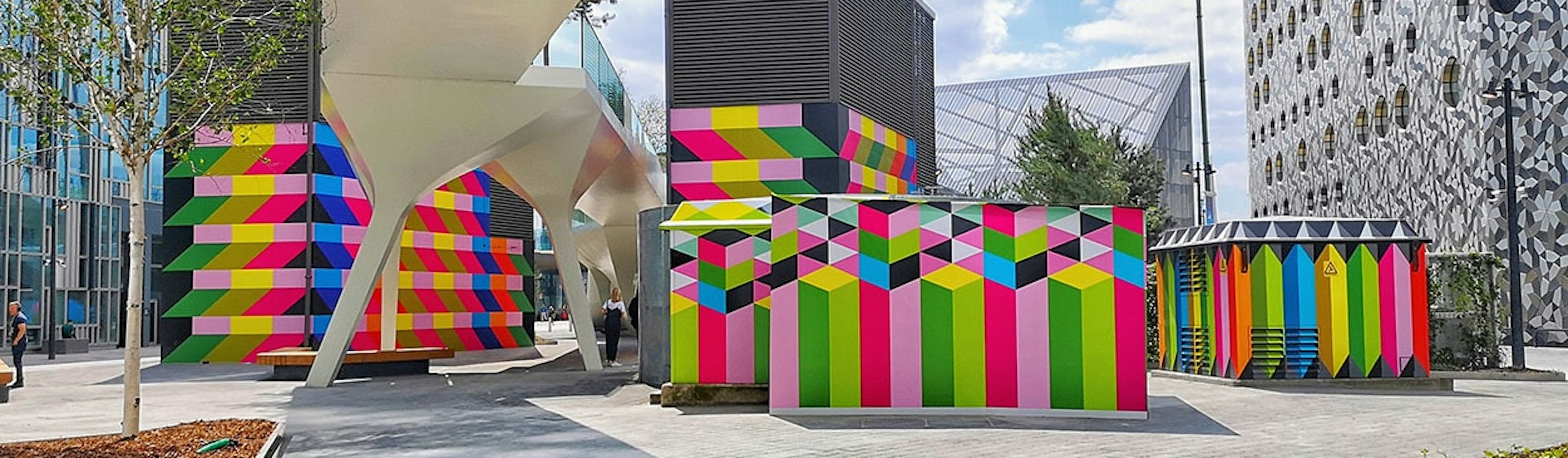 Myerscough’s work is notable for its bright, engaging palette and forms. “I often use a series of four colours in my work to represent the sun. I like the idea that the first two cranes form the sun, and the colours of the other cranes respond to this hot colour palette.” Myerscough creates places from spaces that people like to be in, and it’s important that her work is stimulating — something that makes audiences smile.