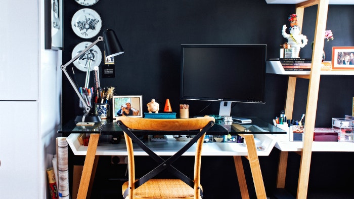 There’s no part of the apartment that hasn’t been carefully considered. Though compact, the study area has a strong presence, almost like a room within a room. The magnetic chalkboard paint delineates the space, giving a surface to write on while the chandelier illustration (drawn by Alex) is a tongue-in-cheek nod to the trompe l’ceil wallpaper that frames the dining area further along.