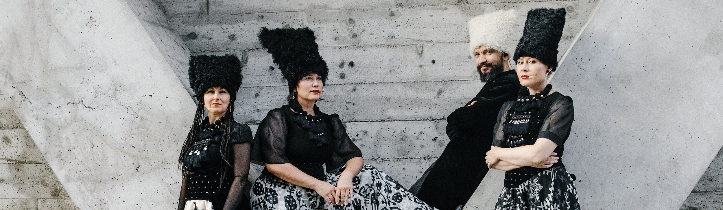 DakhaBrakha are something of an anomaly even in the Ukrainian folk scene. Formed in 2004 to be the house band of the experimental Dakh theatre company in Kyiv, the four-piece is comprised of Marko Galanevych, Olena Tsybulska, Iryna Kovalenko and Nina Garenetska. Formally trained in Ukrainian folk singing, Tsybulska, Kovalenko and Garanetska had never picked up an instrument until joining the band, which has had a profound influence on their musical style; Halanevych describes it as “very naive, minimalist. It’s not virtuoso.”
