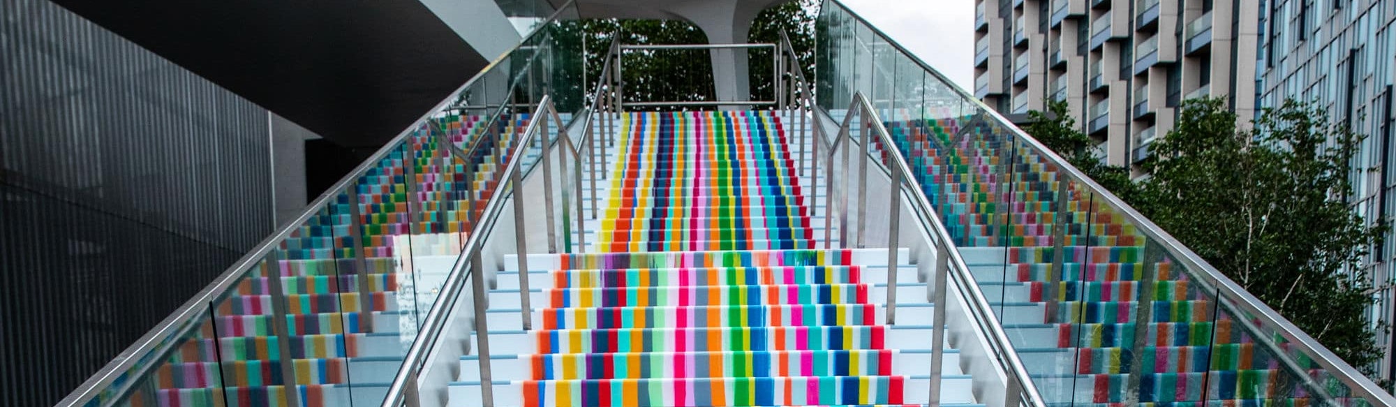 “The thing you notice when you approach from the station,” says Turner-prize nominee Ian Davenport, “is just this big, open concourse. So I was very aware that you'll look at the work from 500m away, and then as you get closer it should start to reveal different aspects of itself.” And so it proves with Poured Staircase; at first it’s a bright smudge of colour, which resolves into distinct, vibrant stripes as you get closer, then at the foot of the stairs the rigid stripes break free to pool and swirl in flowing, organic randomness, adding a sense of fun and playfulness to the space.
