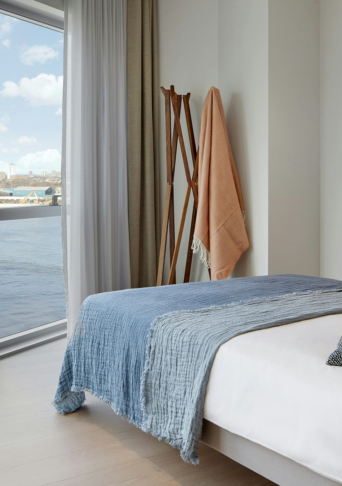 Bedrooms are designed to maximise views and create a comfortable escape to relax. Built in wardrobes allow for plenty of storage space and floor to ceiling glass nooks are a perfect slot for a desk overlooking the water.