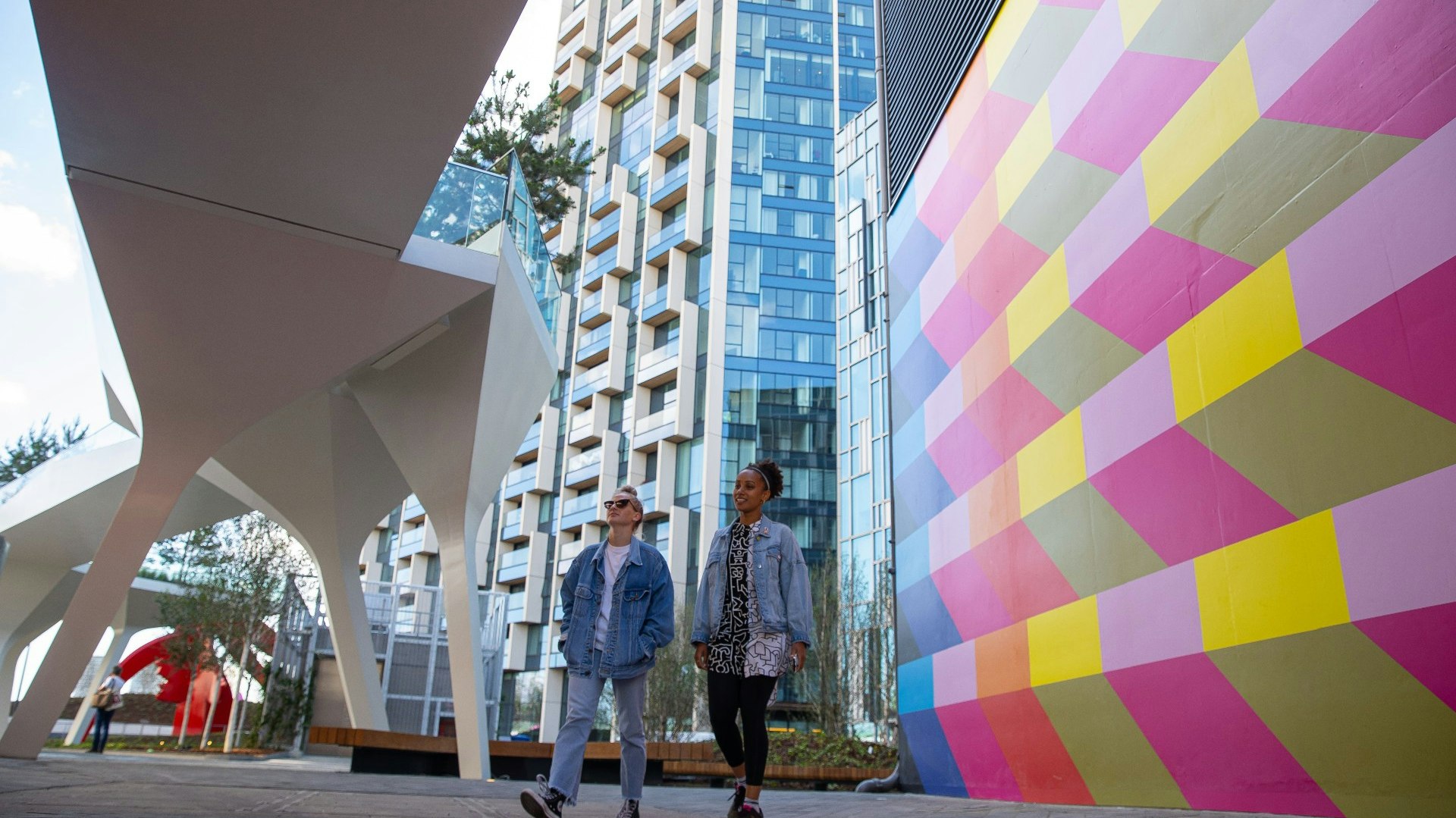 Myerscough’s patterned installation artwork Siblings shrouds the vent shafts on either side of The Tide creating a vibrant threshold and elevating the banal into something extraordinary. Bold and dynamic colours of blue, yellow, pink and green are intertwined in geometric patterns. The illusionary patterns distort and enhance the existing structures which reach the height of 10 metres.