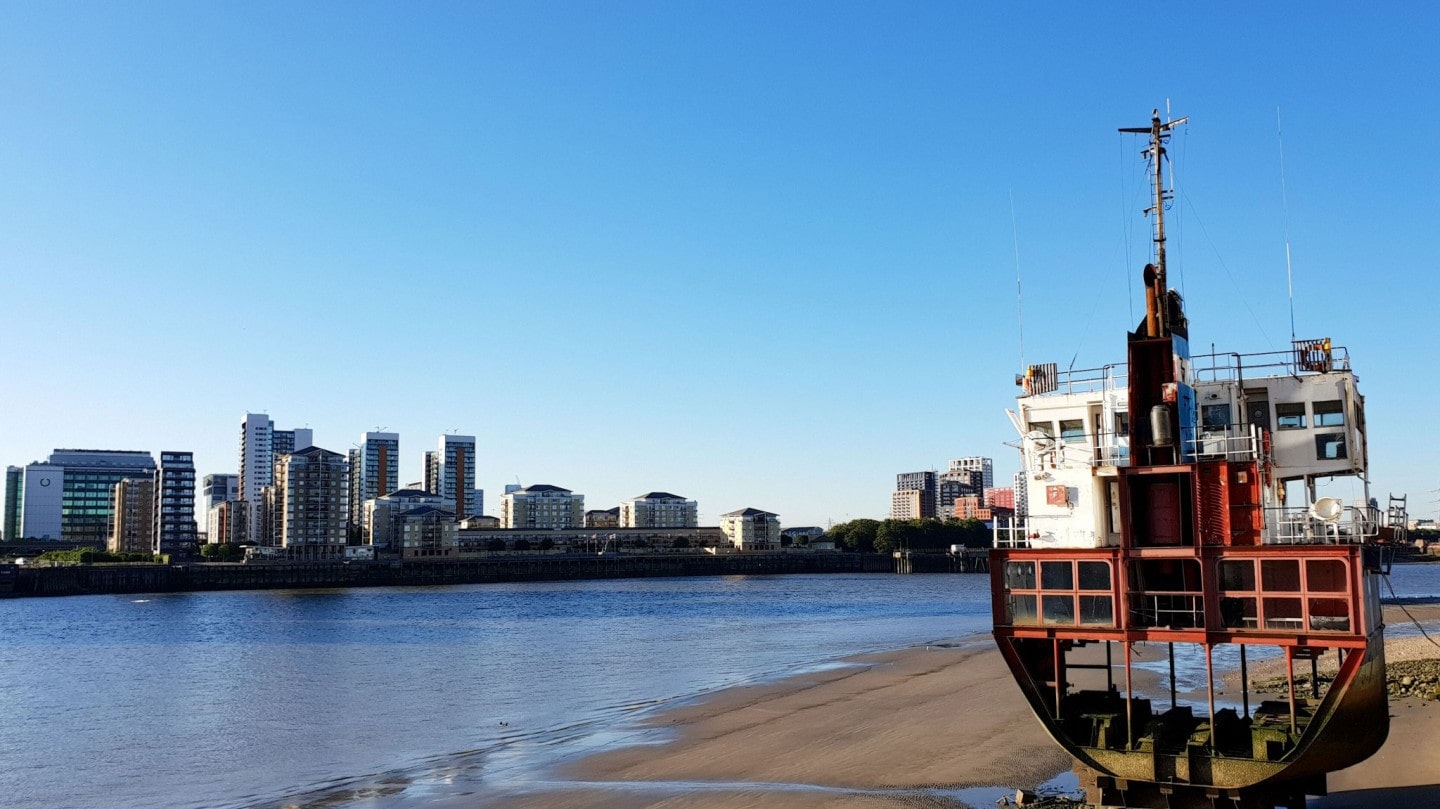Standing permanently on the foreshore of the Thames, this sculpture is a 1/8th slice of what was originally the Arco Trent, an ocean-going sand dredger.