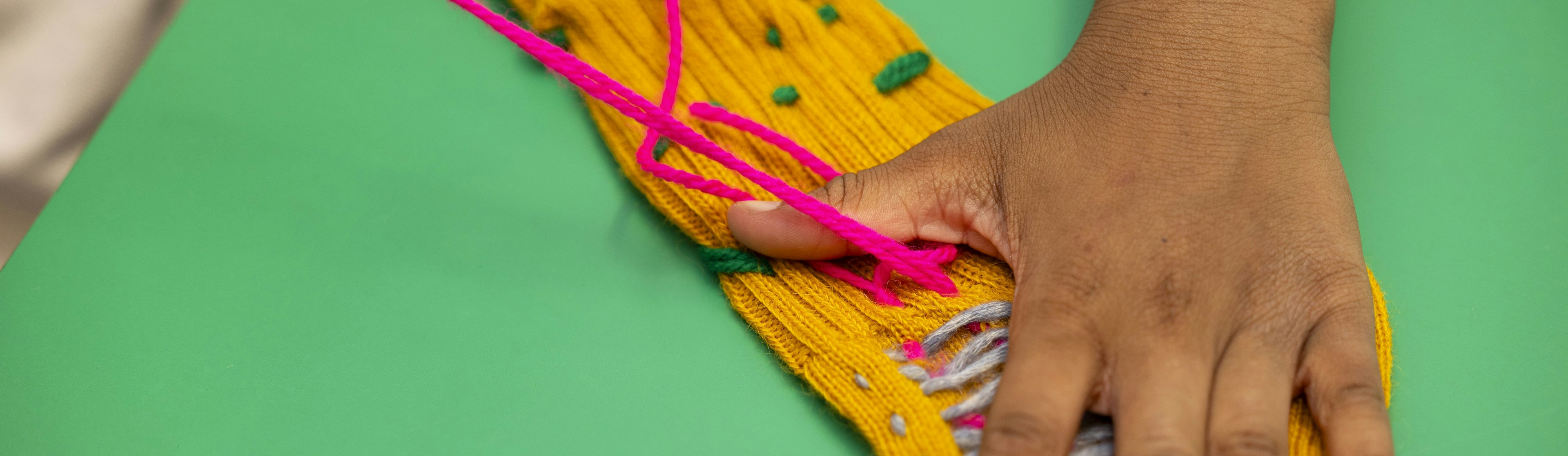 Focusing on the concept of sustainability in fashion and our lives more broadly, Socks: The Art Of Care And Repair will celebrate the everyday act of mending through darning. Central to the exhibition will be a vibrant, colourful installation of 488 socks, each stitched and darned by the Surrey Square Primary School community in Southwark using industry ‘warehouse’ waste socks. Children, staff and families of the school, learnt and practised their darning and stitching skills on socks, during a series of 26 workshops facilitated by Pym in early 2024.