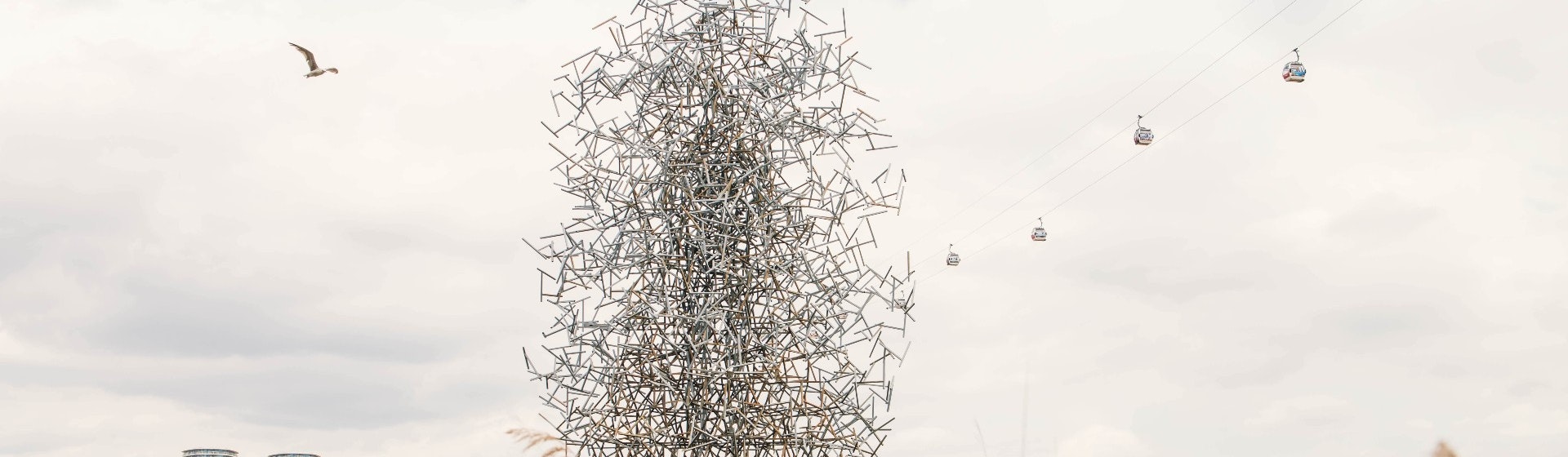This monumental sculpture by British artist Antony Gormley was commissioned for the North Meadow Sculpture Project in celebration of the millennium. Quantum Cloud is composed of a central group of 325 extended tetrahedral sections which are connected to over 3,500 of the same elements extending into space.