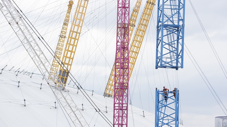 A construction site is not a likely spot to discover contemporary art. But on the Greenwich Peninsula, a series of cranes have been boldly reimagined by London-based designer/artist. Animating the Peninsula skyline, the multi-coloured cranes frame the construction of Upper Riverside, a series of riverfront prisms designed by architects SOM.