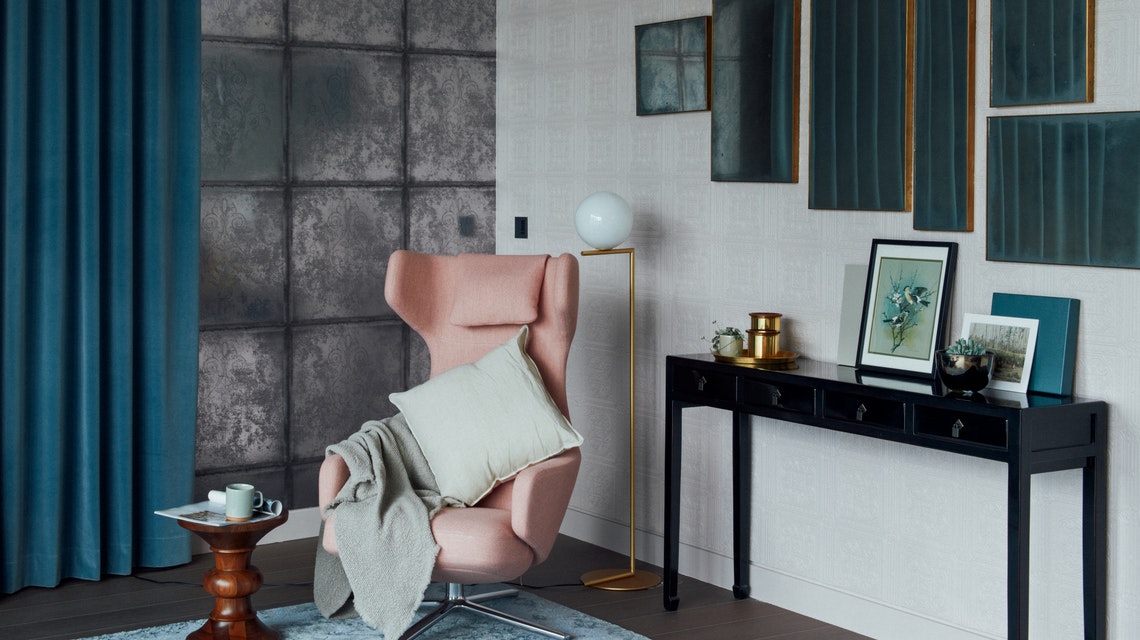 Ogundehin has paid special attention to the use of colour. Natural hues are emboldened by blush pink and vetiver green, and positioned against a moodier-hued backdrop. “We chose these amazing ‘Fade’ hand-painted seascape wall panels from Phillip Jeffries in the lounge area, and then selected the darkest shades from it to colour the adjacent wall using a new glorious inky turquoise blue from Farrow & Ball called Inchyra Blue. As you approach the study and bedroom area, the tones drop to be much calmer. The study is devised as the area for clients to sit and talk business, so here there’s a subtle lift to the scheme via the rug, which brings in some warm terracotta tones.”