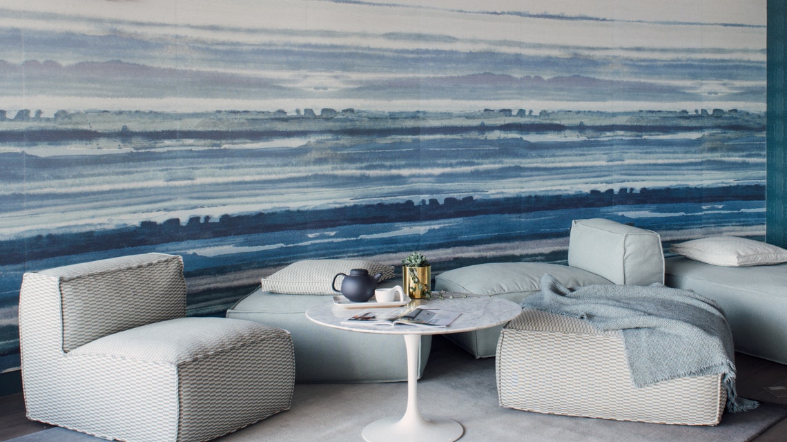 “We chose these amazing ‘fade’ hand-painted seascape wall panels from Phillip Jeffries in the lounge area, and then selected the darkest shades from it to colour the adjacent wall using a new glorious inky turquoise blue from farrow & ball called Inchyra blue. As you approach the study and bedroom area, the tones drop to be much calmer. The study is devised as the area for clients to sit and talk business, so here there’s a subtle lift to the scheme via the rug, which brings in some warm terracotta tones.”