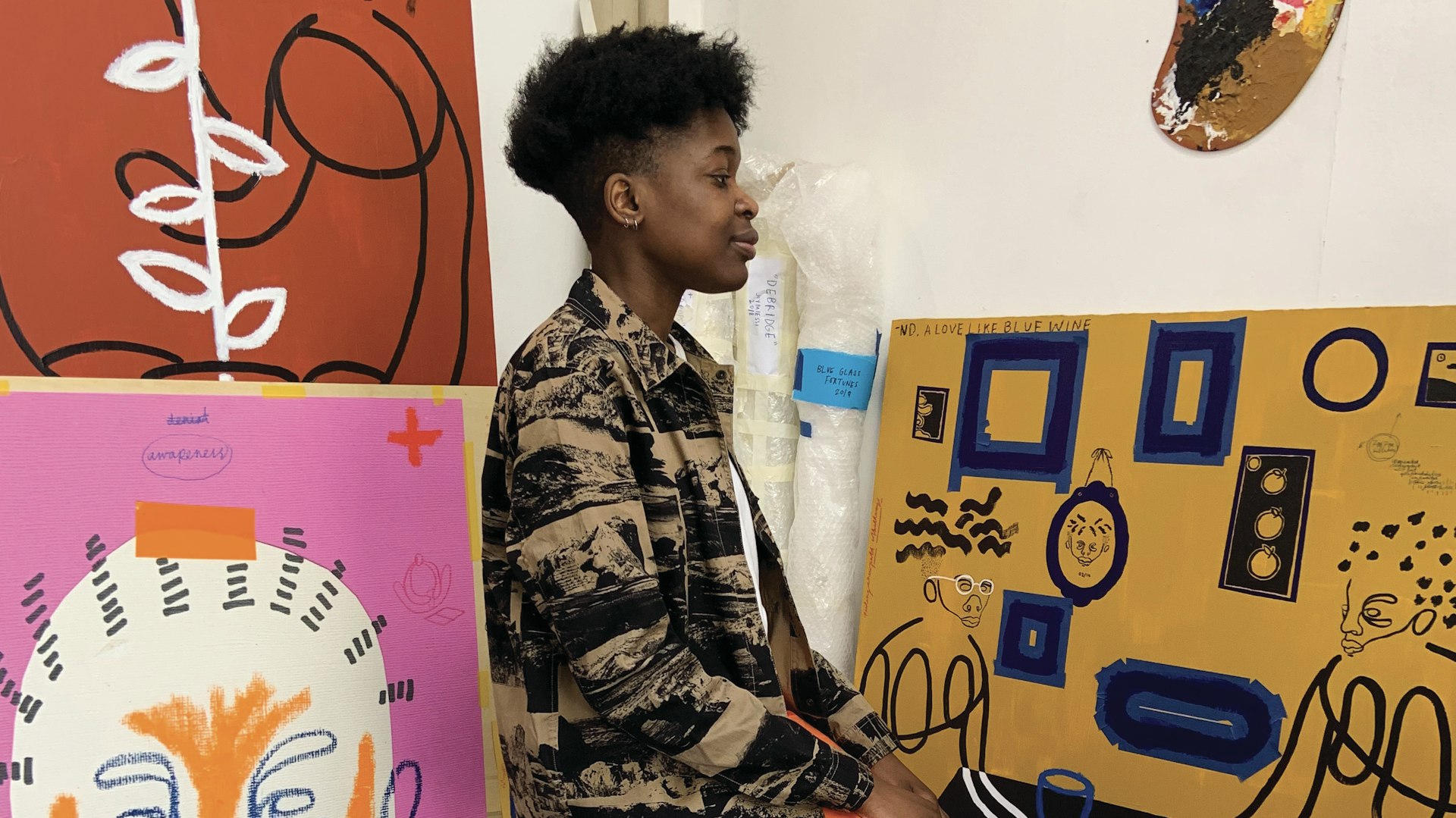 Joy’s had a busier couple of years than most, and with good reason. Their paintings, sculptures, films and mixed media works are immediately alluring; bursting with movement and colour. But beneath that bright surface are rich depths in which to be immersed. Universal themes of memory and ritual and the familial and cultural practices that shape who we are mingle with subject matter that is deeply personal; explorations of gender identity, self-acceptance, mixed British Congolese heritage and the shared mythology of the wider African diaspora. “My work is often so autobiographical I don’t think I’ll ever fully get away from the intimacy,” says Joy.