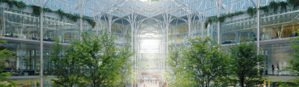 Emerging from the tube into the winter garden you find an urban forest – real trees beneath a glass canopy that unfolds to let in the air and weather – leading to a galleria of pavement cafes and shops. And in a hymn to the ancient orchards that grew on the Peninsula, slender columns create an ‘avenue of trees’, their branch-like crowns supporting the monumental glass canopy.