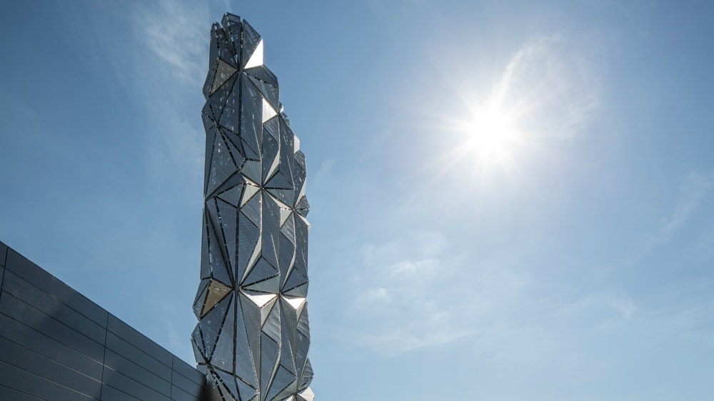 Similarly, when he ‘planted’ the Royal Academy’s Annenberg Courtyard with his piece The Dappled Light of The Sun, a 6m high steel canopy, made from joined-up tetrahedrons, he managed to make its 30 tonnes of steel give the impression of being somehow organic and tree-like. And now, as his latest piece The Optic Cloak is unveiled at the Peninsula’s Energy Centre, he joins the burgeoning collection of artists whose iconic work is not only shaping this nascent part of London but actually drawing people to it. “I was quite interested in the fact that they launched a competition to try and turn this flue into an artwork. There was this idea of, pretending it was not a flue, but a piece of art. There was this sense of disguise, of cloaking something.”