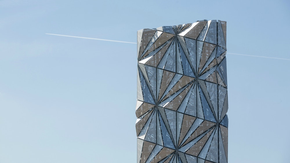 At dawn it gradually reveals itself, throwing off the shadows of night to reflect and refract the sun slicing across the pleated panels. At sunset, the structure shimmies and glows, almost alight with the last licks of daylight.