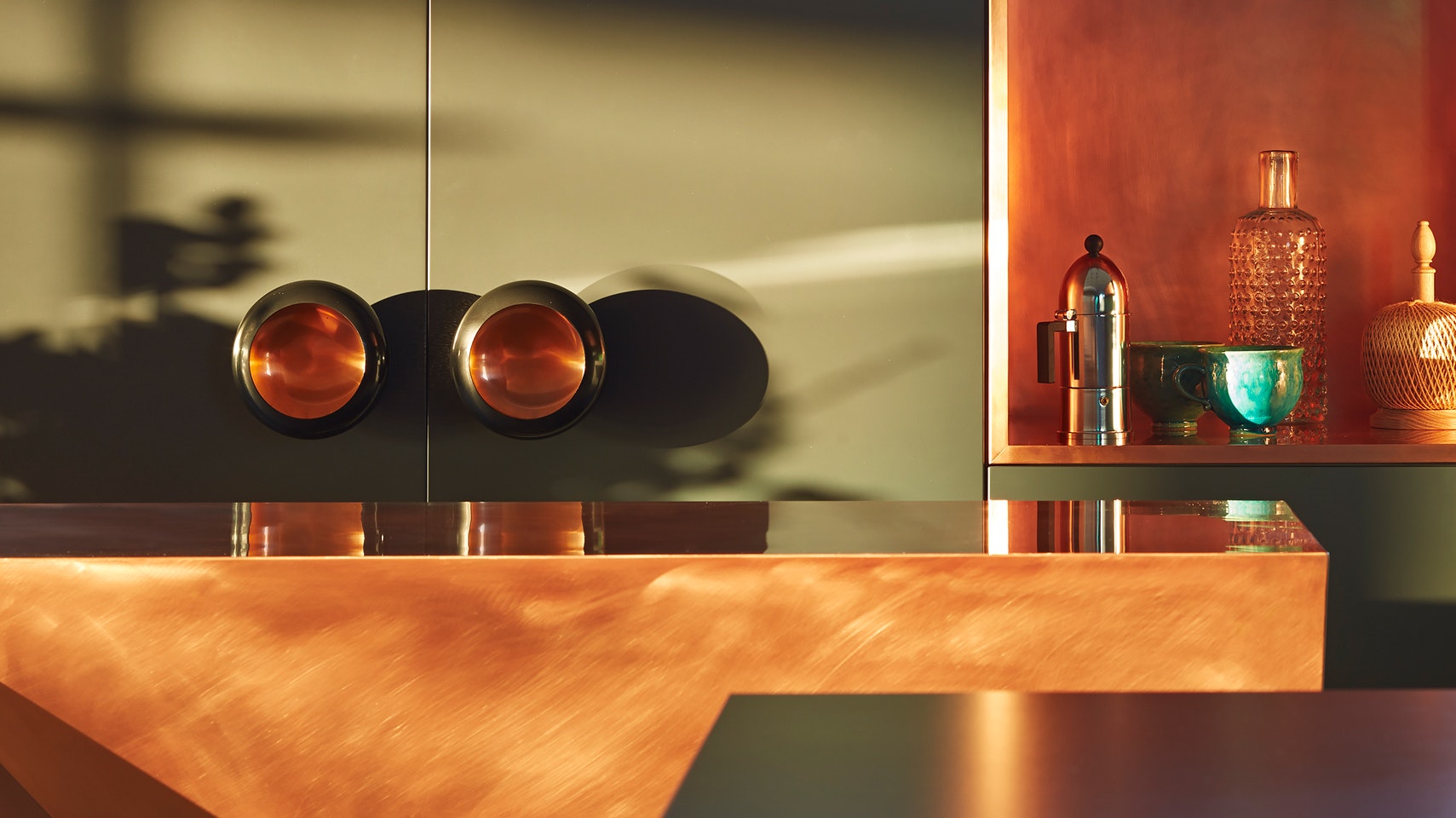 Working with a British craftsman from Wiltshire, Dixon has created copper-clad cabinetry and bold, freestanding anvils for the kitchens, while the bathroom walls are clad in glazed bricks, which reference the traditional salt-glazed bricks that have been used in London for centuries.